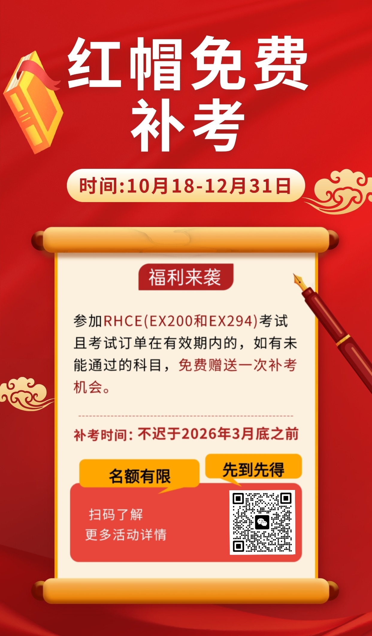 现在,红帽RHCE认证推出重大福利——免费补考机会正式上线,为广大考生的认证之路保驾护航!